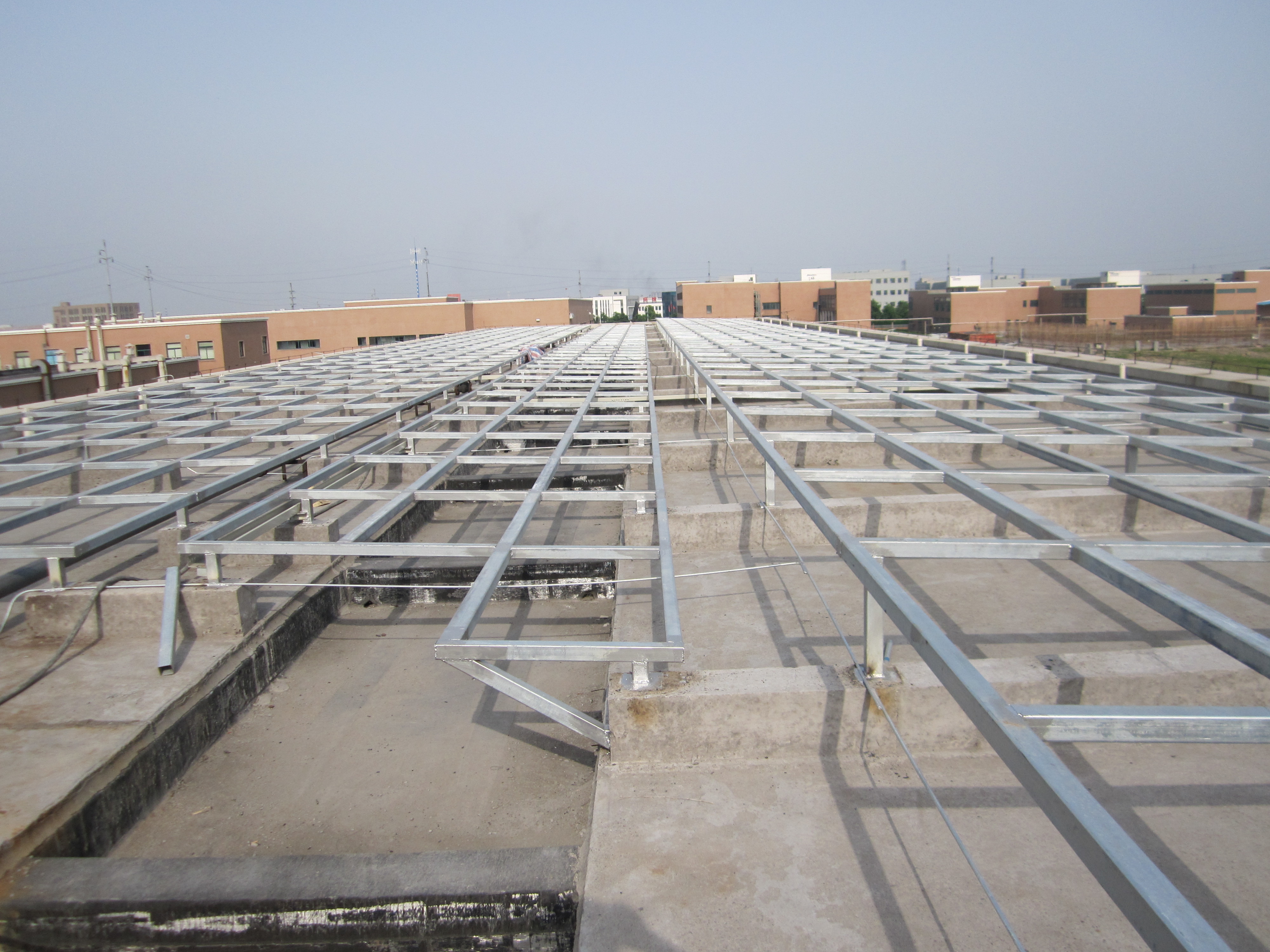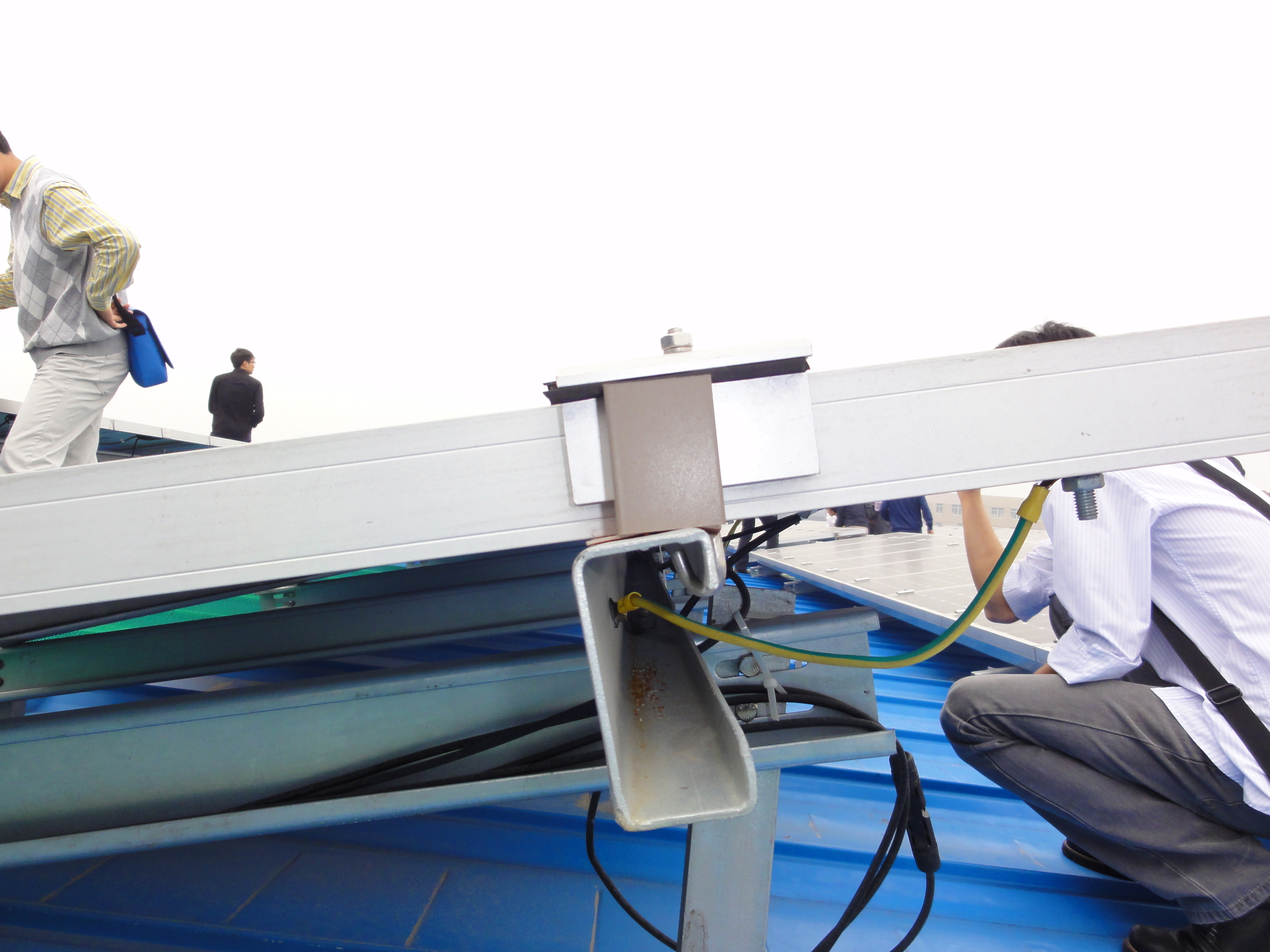 在鋼結(jié)構(gòu)防雷施工中,可以做好夾具之后就下防雷鋼筋,焊接完畢后再進(jìn)行下一步光伏支架的系統(tǒng)的施工,板與板之間用銅導(dǎo)線連接起來,用沉頭自攻釘打到板里面去。或者連接在電池板的螺栓上。