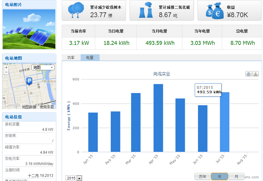 圖中柱狀為1-7月份各月發(fā)電量。圖中左側(cè)發(fā)電效率3.16KWH/KW/day表明:此項目運行至今每1KW每天可發(fā)電3.16度,4.8KWp的容量平均每天可發(fā)電約15.168度。