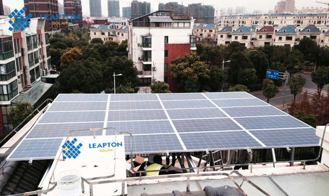別墅,斜瓦屋頂,屋頂情況較為復(fù)雜,采用起棚式支架,傾角5度,組件安裝在支架上,安裝250W多晶組件20塊,功率5.0KW。
