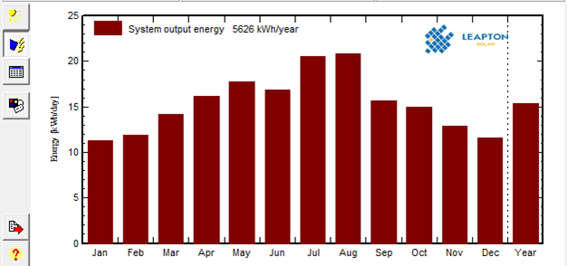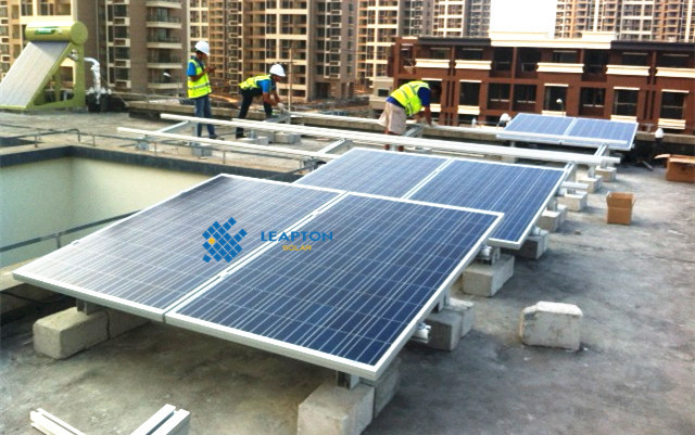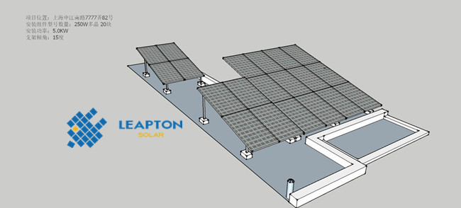 屋頂情況:連棟別墅,混凝土平屋頂。 采用壓載式支架,組件安裝在支架上,避免破壞屋頂防水結(jié)構(gòu),支架傾角15度。經(jīng)建模估算,安裝250W多晶組件20塊, 安裝功率5.0KW。